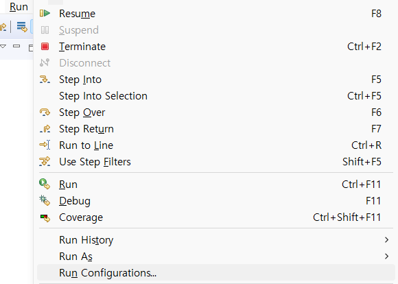 1. eclicpse 상위 메뉴에서 Run > Run Configrations...를 클릭한다.