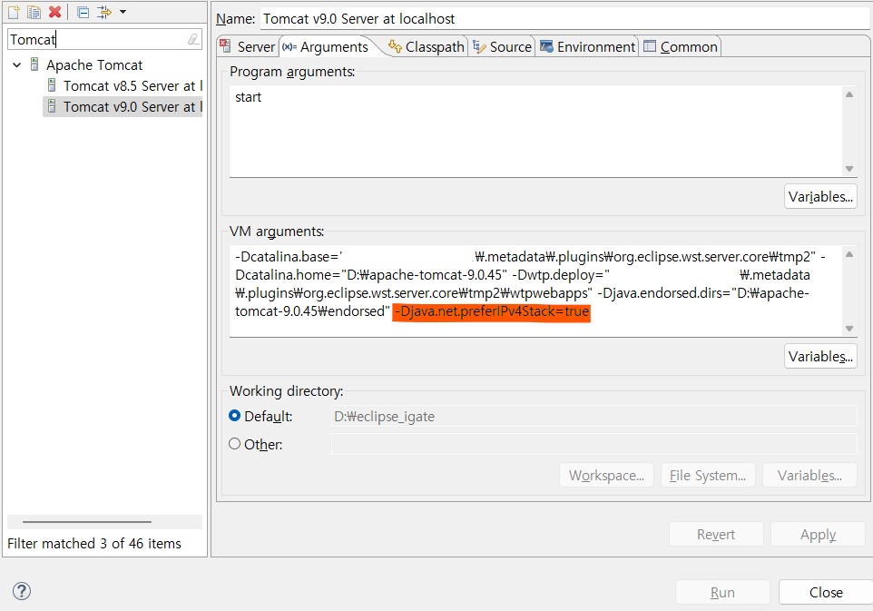 2. Tomcat을 검색한 후 -Djava.net.preferIPv4Stack=true를 추가하고 Apply를 클릭한다.